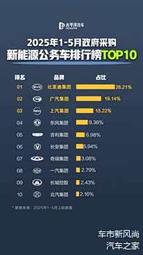 近日,太平洋汽车发布2023-2025年政府采购新能源公务车榜单。数据显示,比亚迪连续2年成为政府采购新能源公务车冠军,今年1-5月仍旧保持大幅领先。