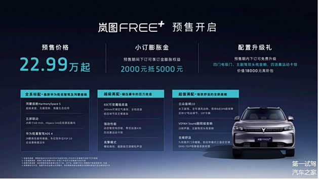 岚图FREE+预售价格区间为22.99万元起。此外,岚图更是给出了的预售权益,预售期间下订可享订金膨胀权益,2000元抵5000元,另还有配置升级礼,预售期间下单即可免费升级四门电吸门、主副驾双头枕音响、四活塞运动卡钳。