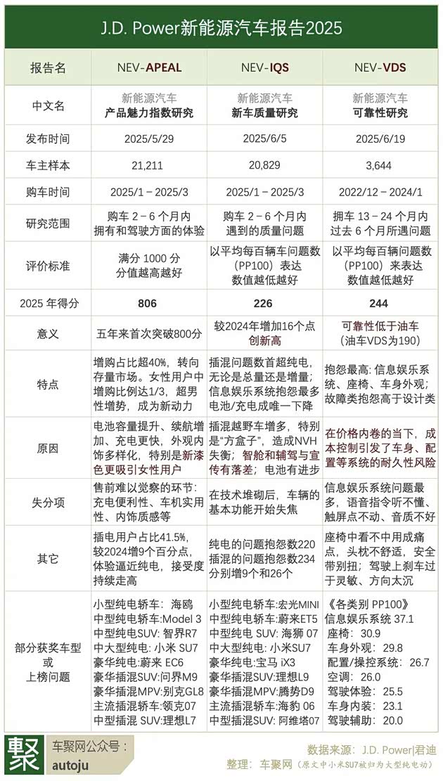 2025年5月底至6月中,J.D. Power 连续发布了三期新能源汽车的报告:产品魅力指数研究 APEAL、新车质量研究 IQS、可靠性研究 VDS。