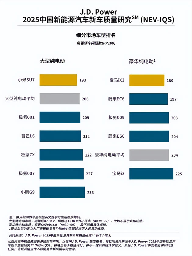 J.D. Power 在IQS 中没有设满分,而是用 PP100 来表达,即每100 辆车中遇到的问题数。以「大型纯电动」这个细分市场看,小米 SU7 以 193 个问题数,名列 IQS 榜首。意思是,每 100 辆小米 SU7 遇到的问题数量是 193 个,是该细分市场最少的,所以排该细分市场 IQS榜第一,即质量最好。