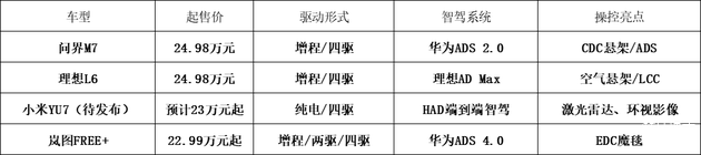 那么,面对同样具备“华为智驾加成”的问界M7、即将发布的小米YU7,以及理想L6、智界R7等同价位选手,FREE+此次的产品策略究竟表现如何?值不值得等YU7不确定的发布定价,还是直接锁定FREE+的现车配置?