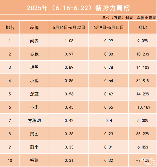 6月第三周新势力销量榜来了,问界再次夺得周冠,后续能否保持,就要看 问界M9/M8的订单能不能稳定增长;零跑排名第二,据说新款C16上市后,上周订单已经冲到了1.2万辆;小米一期工厂将产能分流一部分到YU7之后,导致SU7的销量有所下滑。