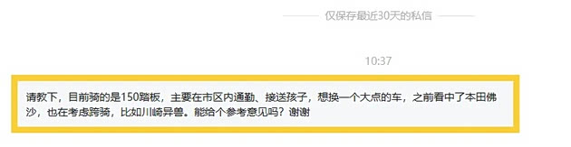这里的关键信息,集中在主要用途、前期预算、目标车型。用途很明确,日常代步,接送孩子,没有什么好过度解读的。前期预算和目标车型也非常清晰,换言之4~5万元的预算,选本田佛沙还是川崎异兽?