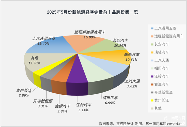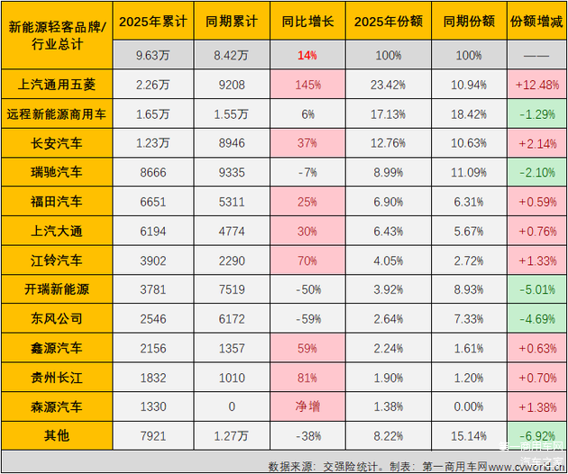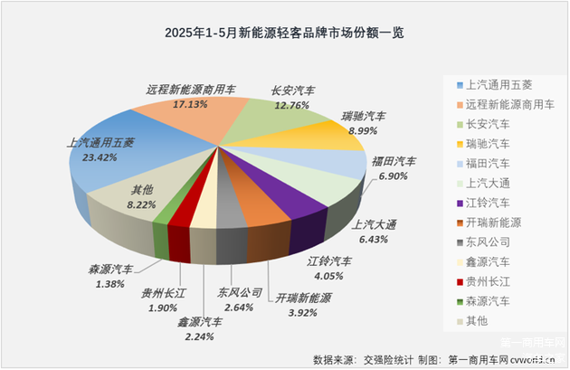 上表可见,2025年1-5月,新能源轻客累计销量实现增长的企业占多数。其中,上汽通用五菱、贵州长江和江铃汽车同比分别大涨了145%、81%和70%,是领涨的3家企业;长安、福田、大通和鑫源汽车,同比分别增长了37%、25%、30%和59%,增速高于1-5月新能源轻客市场整体增速;远程小增6%,森源汽车则是净增长;与此同时,有两家企业今年1-5月销量同比出现两位数下降,下滑最严重的企业同比下降了59%。