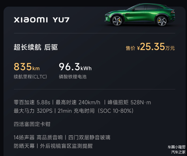 关于售价,小米YU7标准版定价25.35万元,配96.3千瓦时动力电池,纯电续航835公里,比Model Y的入门版还便宜了1万元,尺寸大了一大圈,续航也更长,配置也高出了不少。Model Y一个月在国内都能卖两三万辆,小米YU7也能做到,不足为奇。