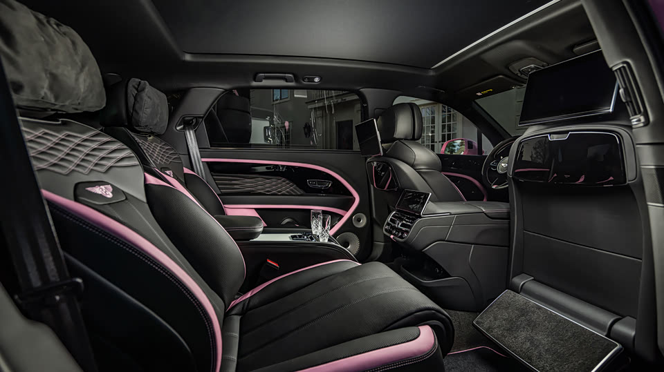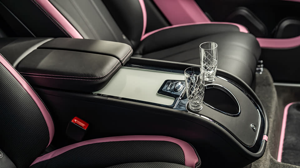 车内方面,主体为黑色,樱花粉(Cherry Blossom)色装饰嵌入其中,后排有定制冷藏柜和Cumbria Crystal水晶高脚杯。