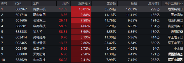 成份股方面,际华集团涨停,内蒙一机尾盘回封涨停,振幅超12%,长城军工7天6板后再涨7.58%%。下跌方面,纳睿雷达、中国海防跌逾2%居前。