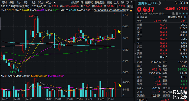 表征国防军工板块整体走势的国防军工ETF(512810)盘中摸高1.58%,场内价格收涨0.79%报0.637元(前复权),创2024年11月15日以来新高!