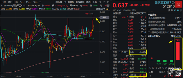 场内交投火热依旧,512810全天成交7552万元,换手率10.83%,继续领先全市场6只国防军工类ETF。