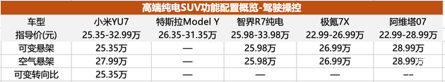 悬架方面,YU7标配可变减震器,空悬安排在了中配Pro上,这个价格门槛相比竞品并不算高,例如整体小一个级别的阿维塔07 EV,也要到28.99万的顶配才给到空悬。至于Model Y,在这个配置上则是空白。