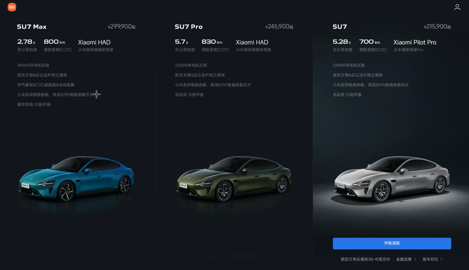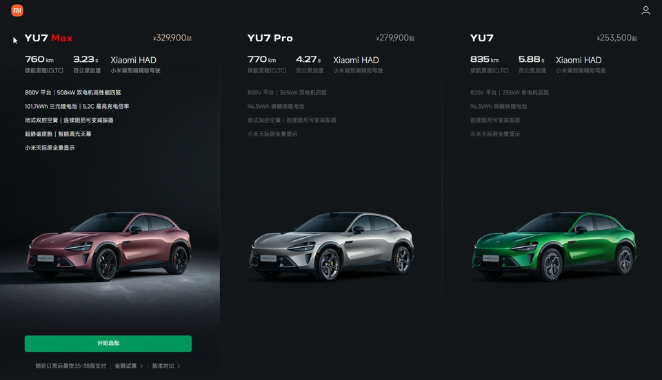 相比一天前,现在小米YU7的提车周期有了点儿变化: 标准版:55-58周(53-56周) Pro版:49-52周(48-51周) Max版:35-38周(33-36周) 看一下SU7这边: 标准版:38-41周 Pro版:49-52周 Max版:33-36周