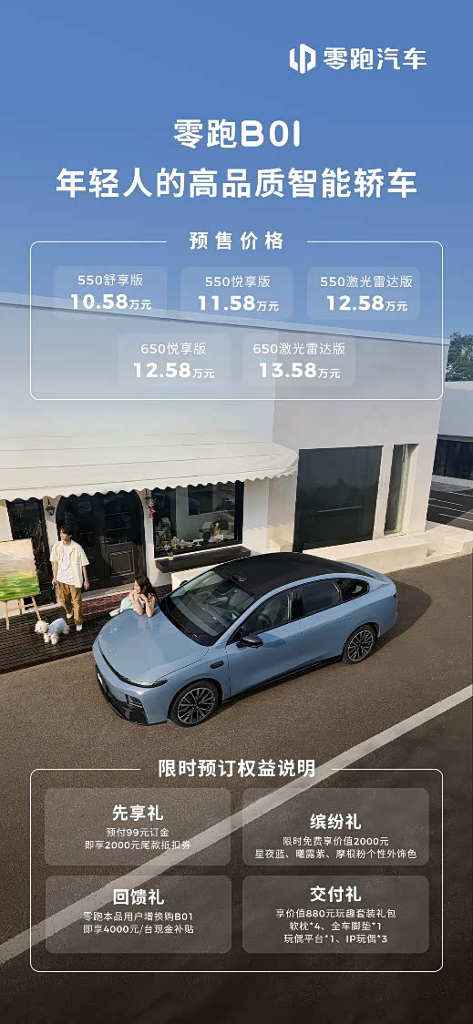 2025年6月29日,零跑汽车正式宣布旗下全新智能纯电轿车零跑B01开启预售,预售价格区间10.58-13.58万元。 2025年6月29日至B01正式上市发布会前,用户预订零跑B01,下订即享4大权益: 先享礼:预付99元订金,即享2000元尾款抵扣券 缤纷礼:限时免费享价值2000元星夜蓝、曦露紫、摩根粉个性外饰色 回馈礼:零跑本品用户增换购B01,即享4000元/台现金补贴 交付礼:享价值880元玩趣套装礼包(软枕*4、全车脚垫*1、玩偶平台*1、IP玩偶*3)