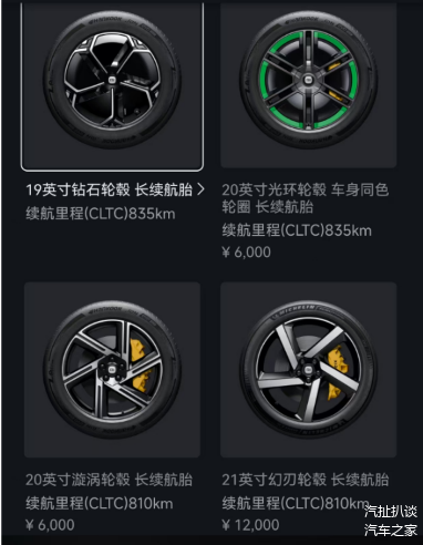 外观除了车漆颜色,轮毂选择上,小米 YU7 提供了足足 7 款样式的轮毂可供选择,尺寸覆盖 19 - 21 英寸。从实际表现来看,19寸免费轮毂对于YU7来说着实寒酸了些,6000元增配到20寸轮毂或12000元增配到21寸轮毂对于YU7颜值的提升可谓十分必要。