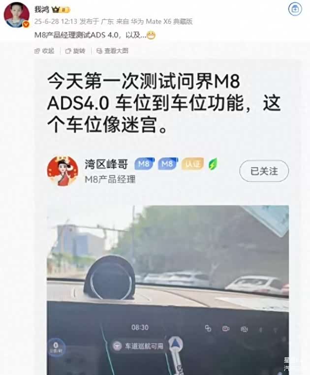 根据网传信息问界M8纯电版将于华为ADS4.0高级智能驾驶系统同步发布,并且现在已经进入到车位到车位的功能实测阶段。
