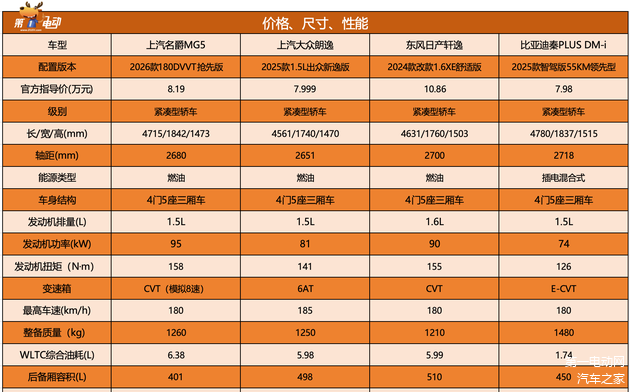 从价位和定位来看,2026款MG5的主要竞品,包括上汽大众朗逸、东风日产轩逸以及比亚迪秦PLUS DM-i等车型。