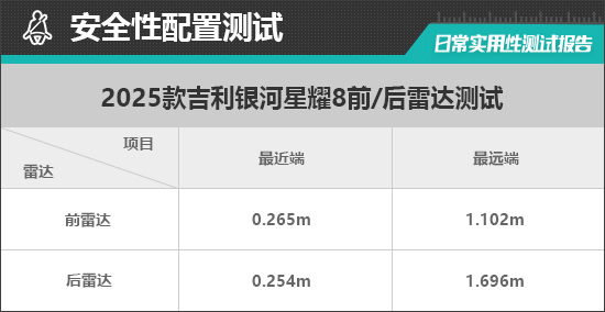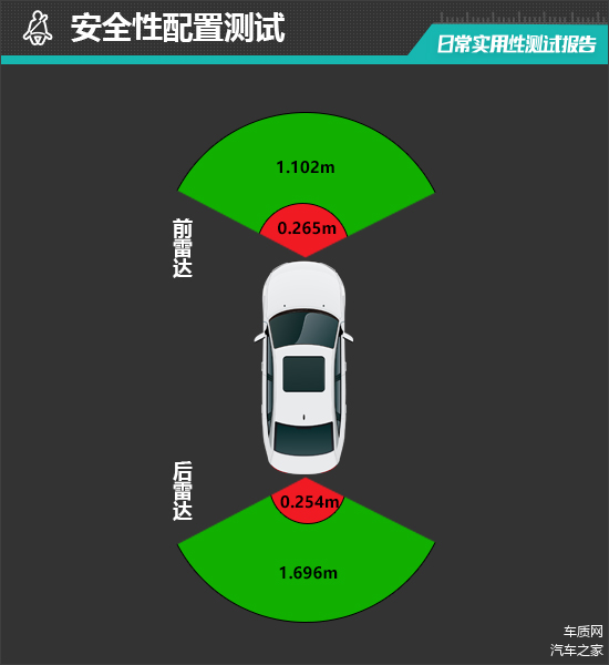 前驻车雷达最远可在1.102m处感应到前方物体,雷达功率表现中规中矩,持续蜂鸣提示距离为0.265m,表现与同级别车型测试均值较为接近。