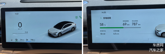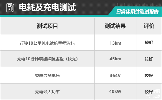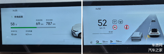 此外,对于充电效率我们也进行了测试。实测人员使用快充桩充电10分钟后(波峰用电),电量从27%充至58%,续航里程增加45km,与车辆电脑预计的用时基本吻合。