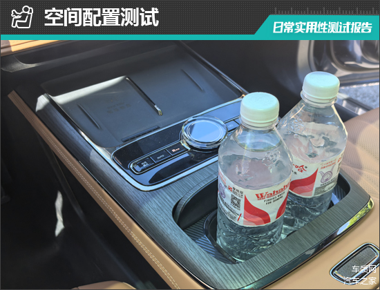 经过实测,评测车的储物数量较多,除了没有配备专属的眼镜盒外,其余物品均能找到合适的位置摆放,储物能力较为出众。此外,评测车还提供了6个杯架,均配备限位器。
