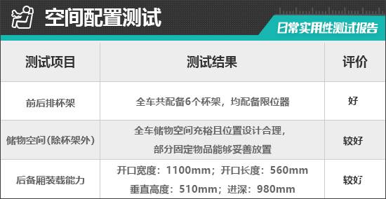 对于车内使用空间的测试,只针对前排触手可及的空间,不包括手套箱、中央扶手箱等需开启的空间。测试方法是将以下固定物品全部放置在前排的各个储物空间内,通过固定物品的放置情况来判断车辆储物空间的表现。测试选定的固定物品为:2瓶常规大小的矿泉水、1部大屏手机、1支口红、1个挎包、1副墨镜、1把折叠雨伞以及1包常规尺寸的抽纸。