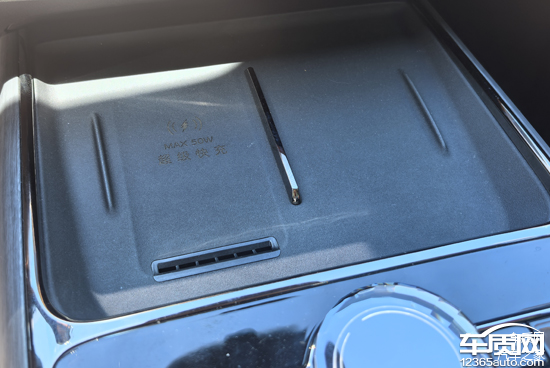 评测车在前排配备了1个50W手机无线充电板,位于中控台上方,位置设计合理,驾驶员拿放手机方便;同时提供通风散热口。此外,无线充电板支持手动开关,用户可以通过中控屏和语音的方式进行控制。