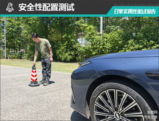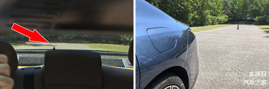 在前方视野测试中,我们采用高70cm的桩桶作为参照物,随后调整车距,直至在主驾驶位可以看到桩桶上沿。经过测试,桩桶与车头最终测得的数据为2.105m,在测试过的同级别车型中处于中游水平。