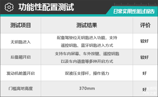 对于消费者来说,门槛离地高度一定程度上决定了上下车便利性。根据实测结果来看,评测车的门槛离地高度为370mm,驾乘人员日常上下车较为方便。