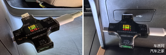 同时,我们对USB接口的电压、电流和功率进行了测试。前排USB Type-C接口的测试成绩分别为9.029V、1.457A 、13.12W左右;前排USB Type-A接口的测试成绩分别5.073V、0.966A、4.911W左右;后排USB Type-C接口的测试成绩分别为9.217V、1.461A、13.46W左右,后排USB Type-A的测试成绩分别为4.992V、0.962A、4.804W左右。
