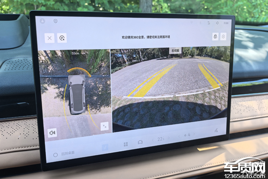 评测车配备360度全景影像,实测整体画质清晰度高且没有畸变。同时,画面支持多个角度查看,并配有可随动转向的倒车辅助线,帮助驾驶者更轻松地完成倒车入库等动作,实用性表现符合预期。