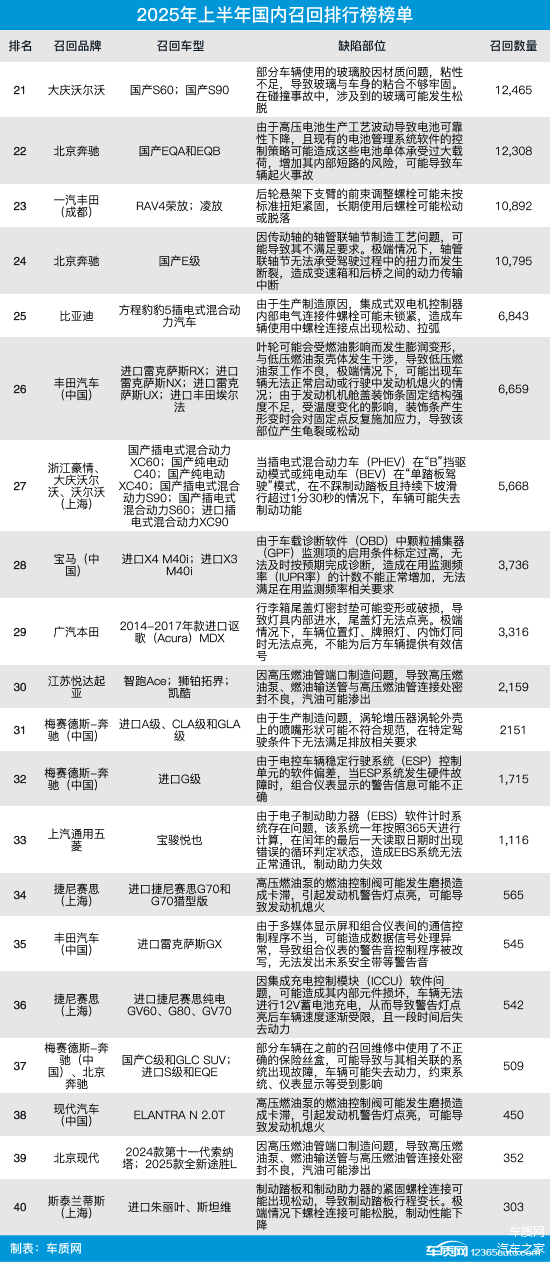 相比2024年上半年,2025年同期扩大召回活动的次数明显减少。其中,丰田因“低压燃油泵故障”召回了旗下部分进口雷克萨斯车型,奔驰因“轮毂饰板可能与轮毂分离”召回了少量国产EQE SUV车型,两个品牌的召回数量均为两位数。扩大召回次数和数量大幅减少,反映出汽车质量管控体系的深层次变化,从“被动补救”逐渐向“主动预防”转变,车企通过技术手段不断提升产品缺陷识别的精准度,并尽可能将缺陷识别节点提前,确保通过召回一次性解决问题,有效避免遗漏。