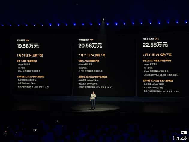 价格策略延续小鹏一贯的亲民路线,共推出3款车型,售价区间19.58-22.58万元,伴随上市推出一系列限时权益活动,直接把新车起售价打到20万内,顶配价格还不到小米YU7和Model 3的入门版本售价。