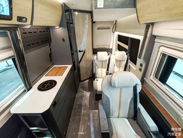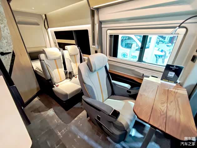 会客区为双排座椅布局,前排单座航空椅支持通风、加热、六点式按摩及空气腰托,后排双座可与电动升降床拼成纵向大床(下铺195×88cm,上铺185×70cm)。多功能桌采用厚重实木板材,边缘斜切圆角处理,搭配阅读灯与窗边木质包覆,兼顾办公与休闲需求。侧边内嵌式窗户设计消除凸起隐患,提升安全性,细节处彰显越界对用户体验的深度思考。
