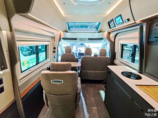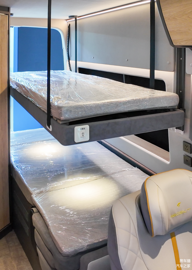 尾部竖床尺寸为195×120cm,可通过会客区座椅扩展至200cm以上,满足双人休憩需求。电动升降床(185×70cm)采用静音电机,一键操控便捷。床垫为高密度海绵材质,搭配可调节头枕,睡眠舒适性媲美家用床品。顶部环绕式储物柜与床下超大行李舱提供充足收纳空间,轻松容纳户外装备。