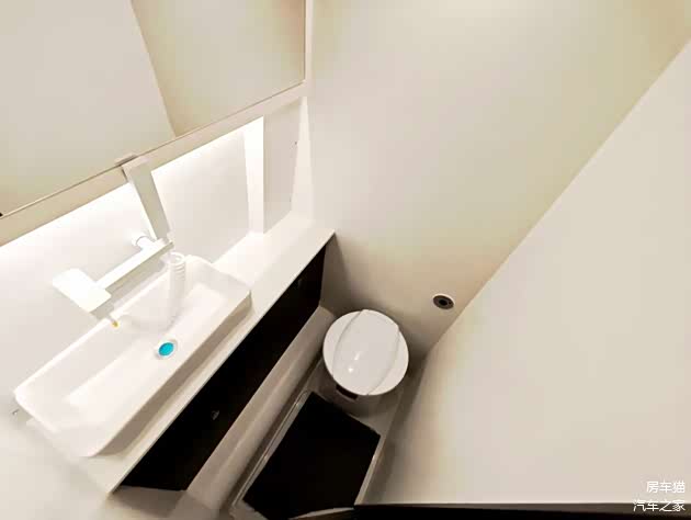 干湿一体式卫浴间配置房车专用马桶、电动排风系统、折叠洗手池及淋浴花洒,墙面采用防水防霉材质,地漏排水效率经实测可应对连续淋浴需求。顶部换气扇与侧窗形成空气对流,快速消除湿气,细节处如可旋转化妆镜、壁挂式收纳架等提升使用便利性。