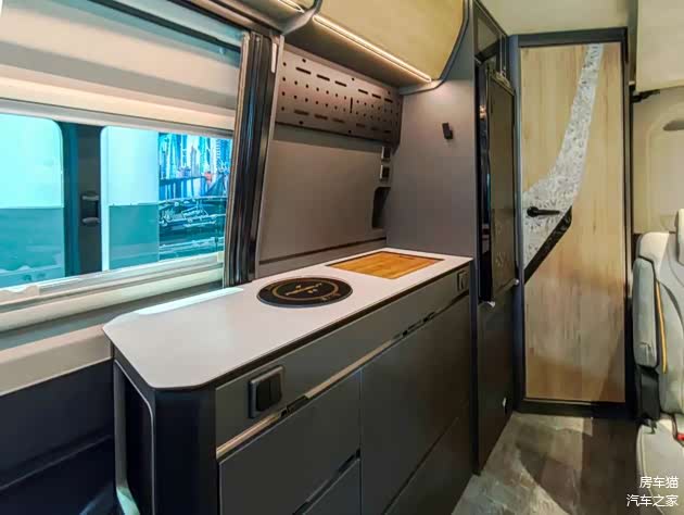 厨房台面延长至会客区,采用与桌面一致的斜切圆角设计,集成房车专用电磁炉、带盖洗菜池及90L冰箱、微波炉。墙面洞洞板系统支持自由悬挂厨具,空间利用率极高。顶部储物柜配备阻尼导轨,下方抽屉采用分格设计,满足长途旅行食材存放需求,整体配置超越同级B型房车标准。