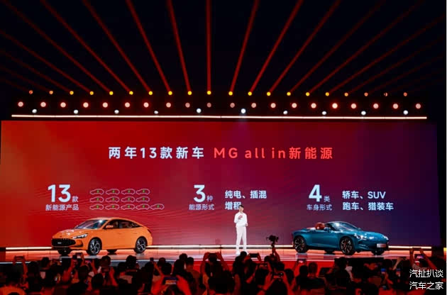 发布会上,MG宣布未来2年将陆续推出13款新能源产品,覆盖纯电、插混、增程3种新能源形式,涵盖轿车、SUV、跑车及猎装车4大车身形式。