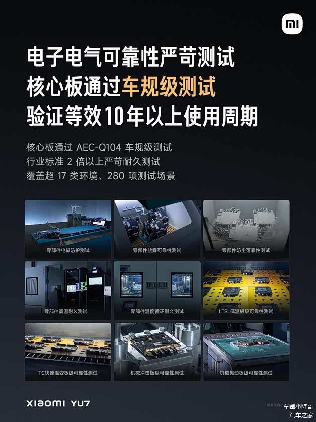 那么消费级芯片使用在车机上,会不安全吗?首先,小米汽车并不是第一个将消费级芯片放到车上,此前比亚迪、特斯拉(桌面芯片)等汽车品牌也这么干过。小米官方表示,小米YU7的车机的核心板通过了AEC-Q104车规级测试,行业标准2倍以上严苛测耐久测试。