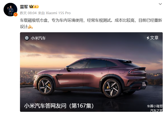 不过雷军也表示,100多的售价确实贵,正在让自己的同事降低成本,不过这个车规级纸巾盒已经卖断货了。