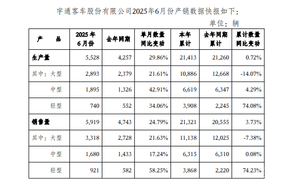 2025年上半年,宇通客车大型客车销量达1.11万辆,同比下降7.38%;中型客车销量达6315辆,同比增长0.08%;小型客车销量达3868辆,同比增长74.23%。
