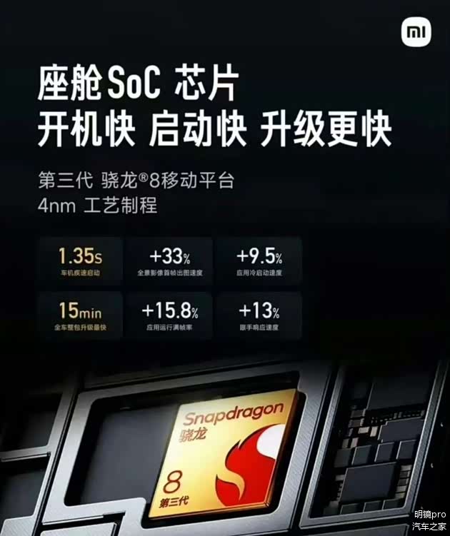 在小米YU7还首次把骁龙8 Gen3手机处理器用到了车机上。小米YU7采用的骁龙8 Gen3芯片导入了汽车级制造流程与车规认证(车规级封装工艺改进),以确保安全与可靠性。 尽管高通平台原为消费性产品,但经过车规等级调整后,已达车用安全标准。