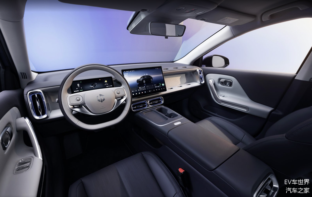 零跑B01的内饰采用了"悦动几何"的设计理念,整体设计较为简约,拥有幻月紫与纤云灰2种内饰配色。中控台搭载了8.8 英寸全液晶仪表与14.6英寸2.5K高清中控屏,内置8295芯片智能座舱和Leapmotor OS 4.0 PLUS交互系统。