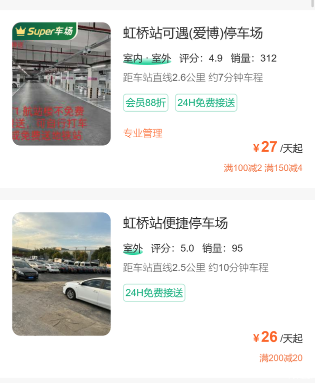 其实,现在还有另一个既方便又便宜的选择,那就是在虹桥站附近的停车场,收费仅25到35左右一天,除了收费便宜之外,这些停车场还会提供免费接送,直送虹桥站。