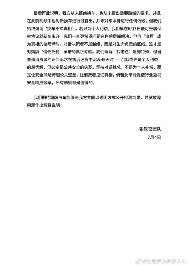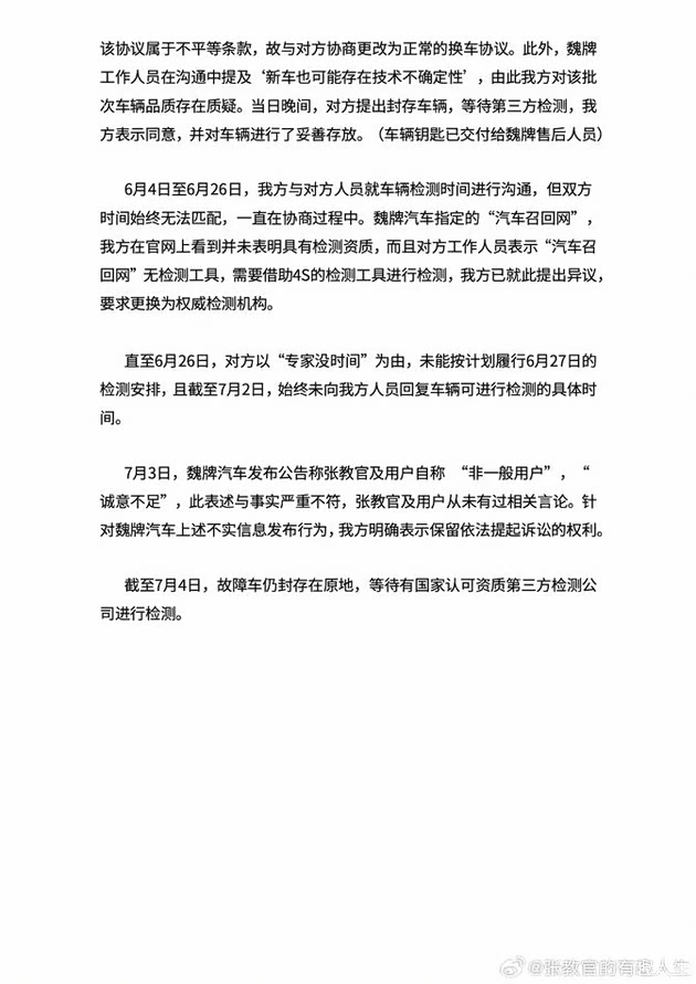 假如不是新媒体时代,张教官也不会非要对话魏建军,一般流程修车,再修车,按照三包法规定,实在修不好,可以换车,换新车!