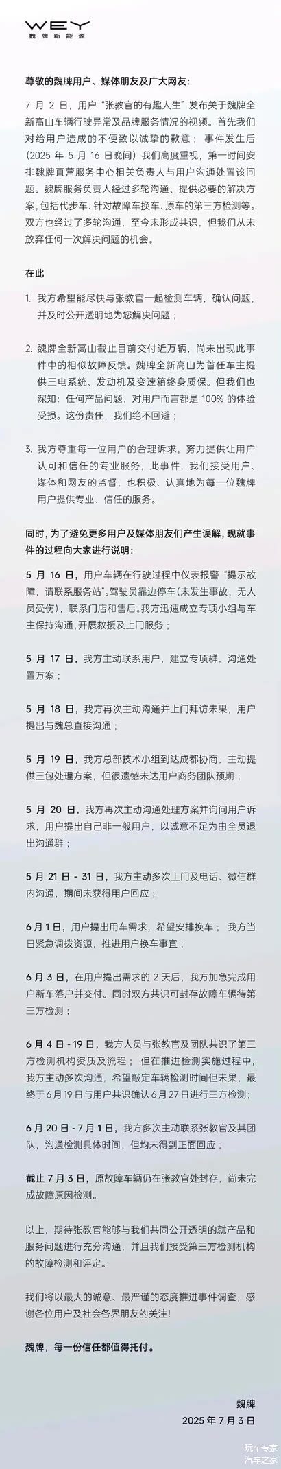 事件回顾:张教官购买的魏牌高山 8 新车在行驶短距离后出现高速自动降速、油门无响应等严重故障,这对消费者而言是极大的安全隐患,魏牌理应重视并妥善处理。魏牌虽提出了换车、第三方检测等方案,但在沟通中,双方因保密协议、检测机构资质、高层是否应介入等问题产生分歧,导致事件持续发酵,未能及时解决。