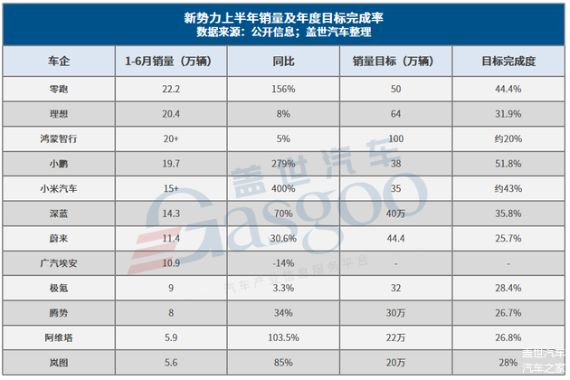 其中零跑更以22.2万辆的累计销量和156%的同比增速强势登顶,成为上半年最大“黑马”。而小鹏汽车凭借超过去年全年的19.72万辆销量,成为唯一达成全年目标过半的企业,完成率达51.8%。