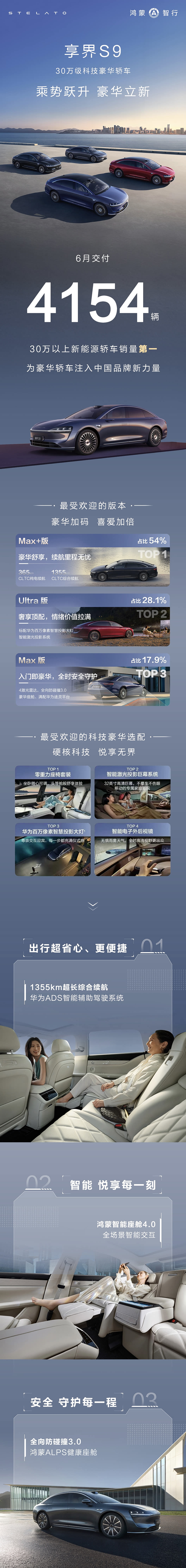车盟快讯:7月8日,享界汽车举办享界用户星享之夜活动,活动中北汽集团董事长张建勇和华为常务董事、终端BG董事长余承东共同发布享界星型车标“寰宇之星“,也分享了北汽与华为在研发享界S9上一路走来的点点滴滴,同时也带来了让人激动的消息,享界品牌全新旅行车将于今年秋季正式上市。享界S9 6月共交付4154辆,持续稳坐30万以上新能源轿车销量榜首。大家对于享界S9的印象如何呢?
