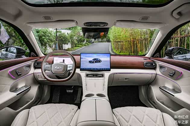 相对于外观,座舱的高级感会更加直观。风云A9L整体内饰比较简洁,提供了暮秋暖阳、晨光柑橘和夜色枫丹三种配色。细节之处,比如双绗缝工艺的座椅搭配加热/通风/按摩功能,标配的9安全气囊,分段式全景天幕,23扬声器的伯牙之音音响,前后排侧窗双层隔音玻璃,后排侧隐私玻璃,车内香氛装置等都让风云A9L有了挑战C级豪华车的底气。