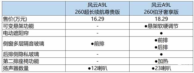 接下来是260伯牙奢享版,售价18.29万,价格贵了2万。升级的配置有悬架软硬调节,电动遮阳帘,后排多层隔音玻璃,后排侧隐私玻璃,第二排座椅加热,23喇叭扬声器等。其实升级的配置不算多,侧重点在于悬架和音响系统。