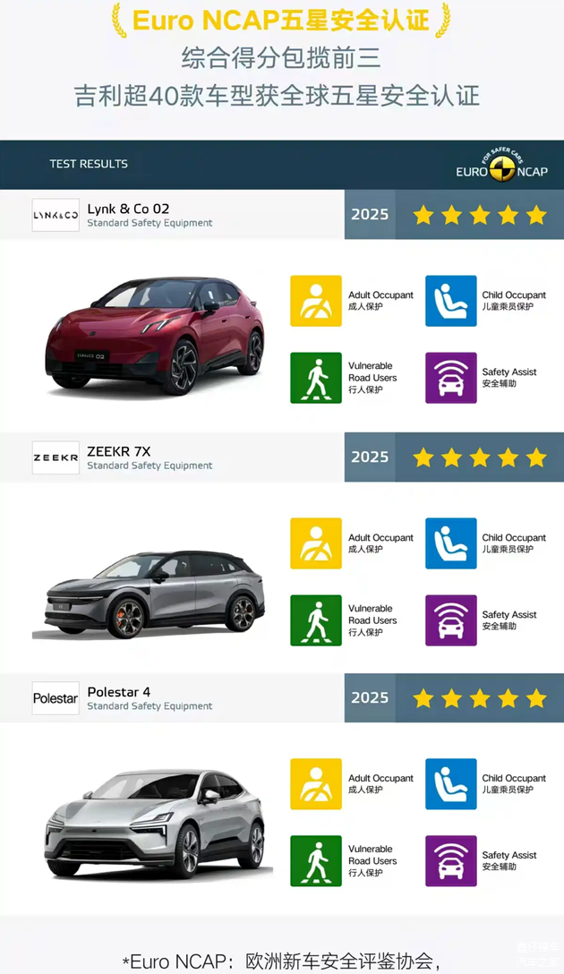 值得注意的是,本轮测试的三款车型均来自吉利控股集团旗下,涵盖不同细分市场与产品风格。从近年来集团整体在安全测试方面的成绩来看,其在Euro NCAP、澳洲ANCAP与C-NCAP三大主流安全评估机构中,已有超过40款车型取得五星成绩。