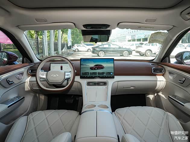 内饰方面,双辐方向盘、全液晶仪表与15.6英寸中控屏构成数字座舱核心,搭载高通骁龙8255芯片确保系统流畅度。环抱式座舱设计配合平直中控线条,营造出符合其定位的豪华氛围。