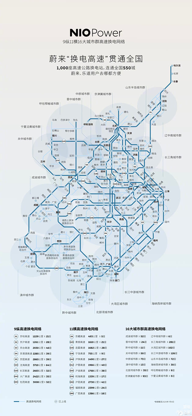 据介绍,蔚来能源完成全国主要城市间高速公路换电网络建设,连通全国550城,蔚来和乐道用户高速公路补能焦虑宣告终结。截至7月9日,蔚来累计已在全国范围内布局3399座换电站、2883超充站。